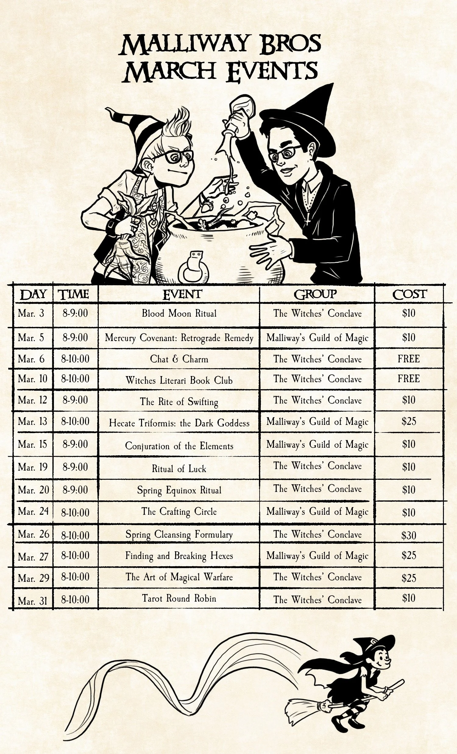 Join our Discord server to chat with members of the Malliway’s circle outside of the shop, share spells, and help plan future events!
