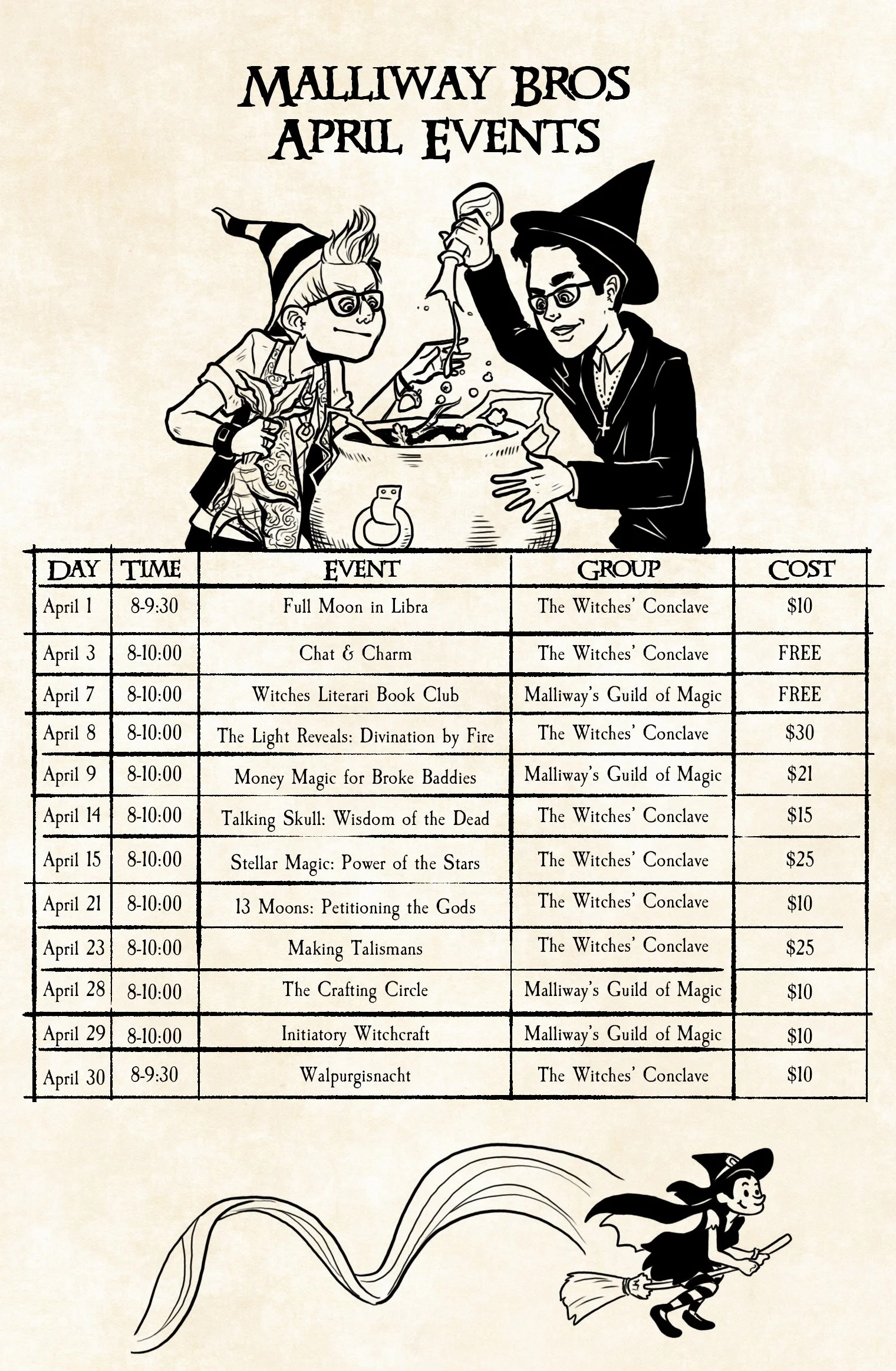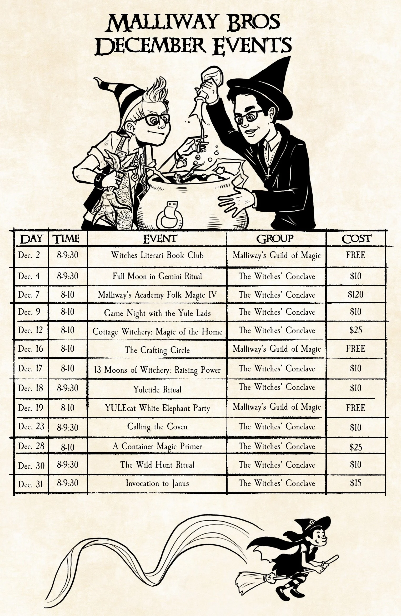 Malliway Bros presents a full array of enchanting events for those wishing to learn magic, partake in rituals, celebrate seasonal shifts, or convene with other broom-riding cackle clowns in delightful witch-themed gatherings. We host two major groups through the shop, both found on meetup.